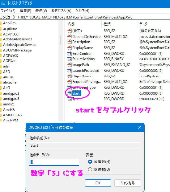 左下もしくは下部の「windows」マークをクリック→「検索バー」に「レジストリエディター」を入力して立ち上げる→HKEY_LOCAL_MACHINE\SYSTEM\CurrentControlSet\Services\AppXSVC に進む→「start」をダブルクリック→値のデータ「3」にする→パソコン再起動