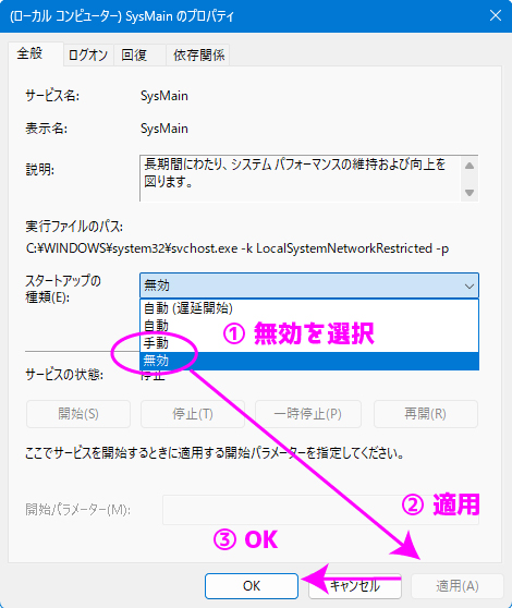 左下もしくは下部の「windows」マークをクリック→「検索バー」に「サービス」を入力してサービスアプリを立ち上げる→一覧の中から「SysMain」をダブルクリック→スタートアップの種類を「無効」にして「適用」「OK」と進む